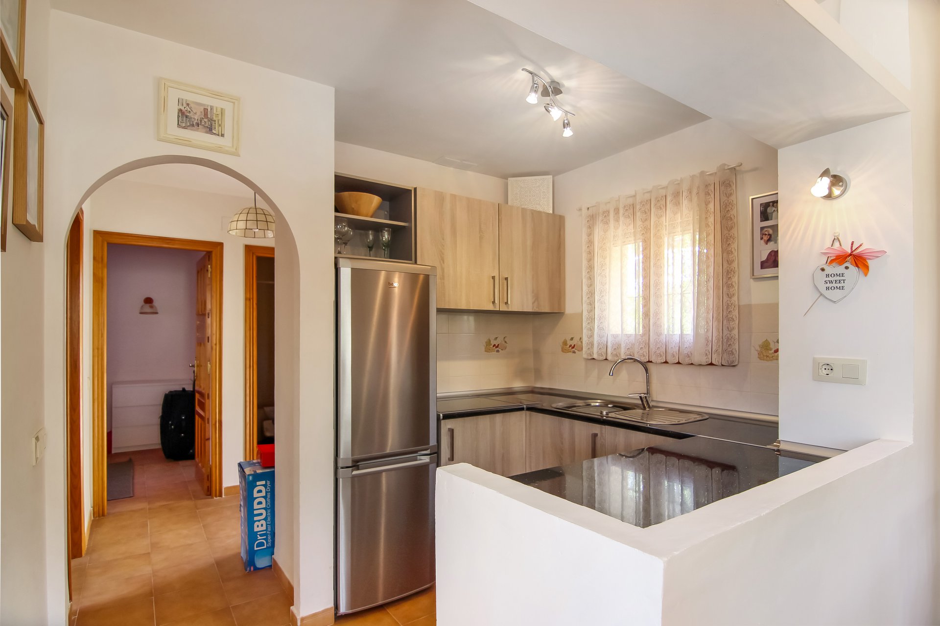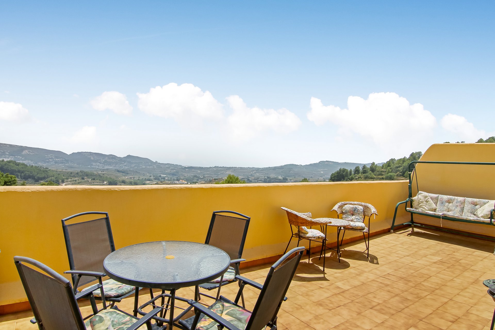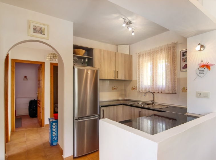 This apartment, located in the hills of Teulada, consists of 2 bedrooms, 1 bathroom and a large, south/west facing terrace of 28 m2 with stunning sea and mountain views. In a peaceful, quite and private location, yet only 5 minutes to the town centre. The complex has a large communal pool, outside showers, 2 tennis courts and petanque area. Great value for money and could produce excellent rental returns.