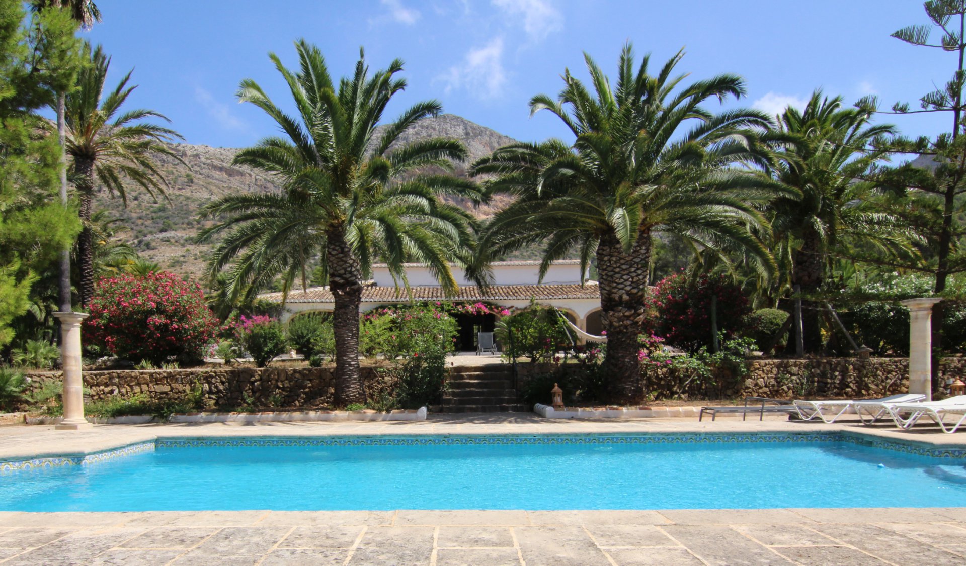 Unique finca with original features, sitting on a plot of 20000 m2. Arriving at the property there is a covered parking area, an outdoor kitchen and terraces. The terrace overlooks the park and leads onto the swimming pool. The living room with a magnificent fireplace, has access to the two spacious bedrooms with plenty of storage and ensuite bathrooms. On the other side, the equipped kitchen, spacious with an adjoining pantry and a patio overlooks the Montgo. The property includes many fruit trees. There is a magnificent second villa for guests. This villa with 3 bedrooms and 3 bathrooms is very well equipped; it also includes a workshop. A unique property designed by an artist of great taste and culture.