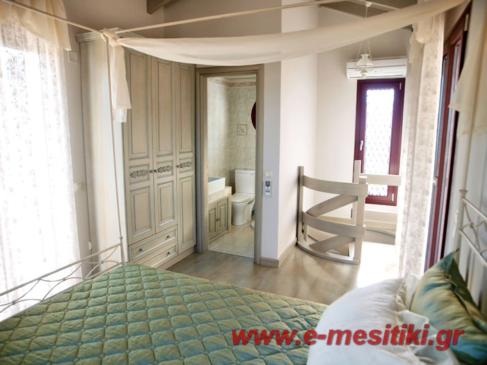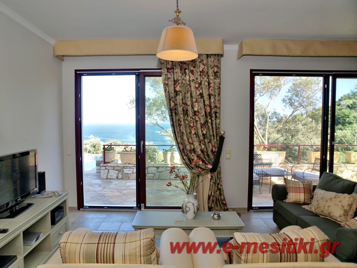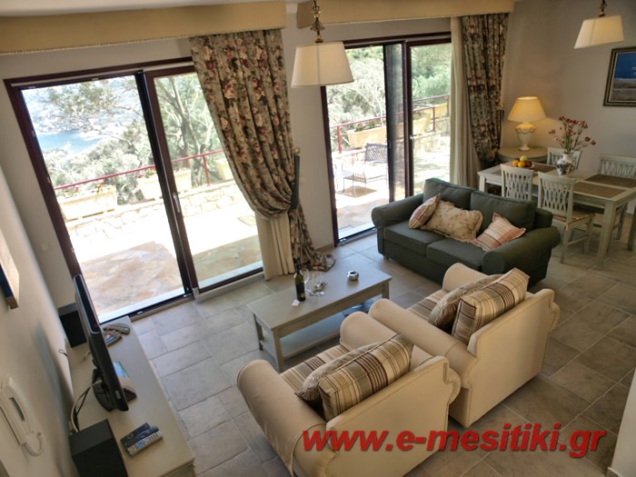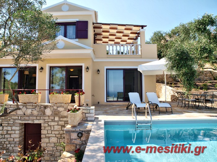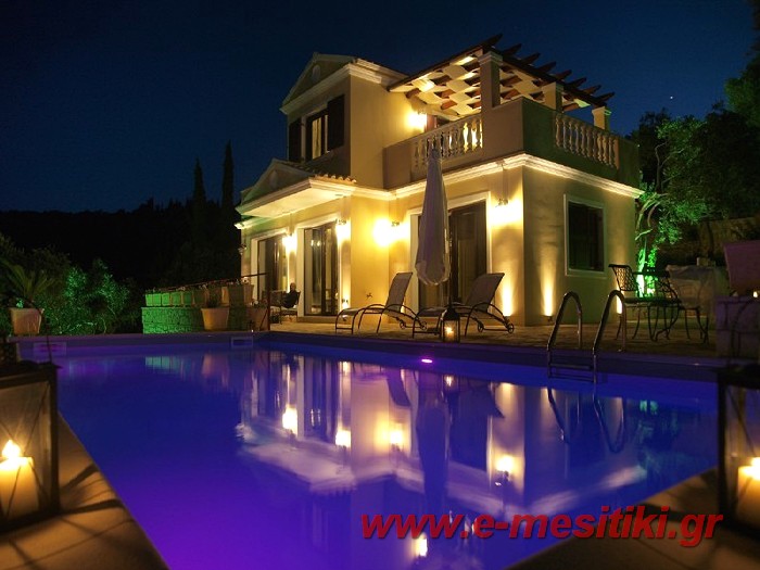 Luxury house for sale. It is 100 sq.m. It consists of two bedrooms, a large sitting room, a fully equipped kitchen and two bathrooms. They have got balconies with a view of the sea, a swimming pool, air conditioning, BBQ and a big yard. It is located in Gaios of Paxos island