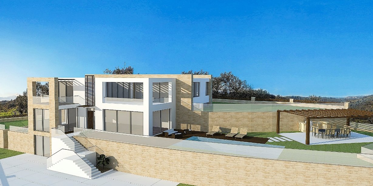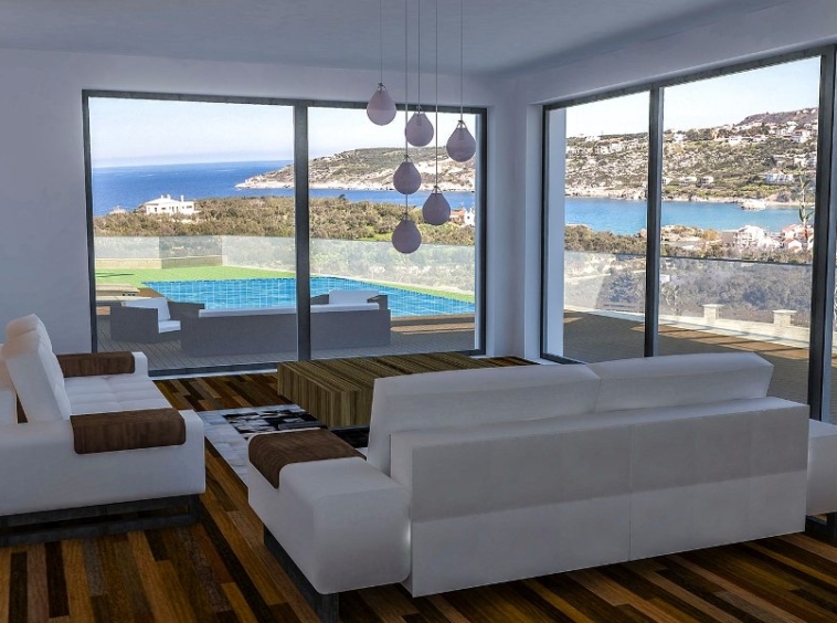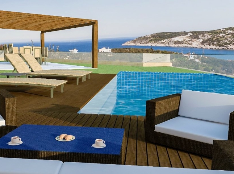 Main characteristics: The total area is 457 sq.m. The plot is 2684 sq.m. Swimming pool: 50 sq.m. Year of construction: 2015. Distance to the sea is 900 m. Distance to the port: 17 km. Distance to the airport is 32 km. The distance to the village is 25 km. 4 Bedrooms. Bathrooms 5. Levels 3. Additionally: furnished, fireplace, parking, swimming pool, connected to a sewerage system, connected to a water pipe, connected to an electrical system, there is a heating system, a solar collector for heating water, Description This three-storey building has a total area of 457 sq.m., where each room is functional planned, provides comfort and a magnificent view of the horizon of the blue sea. A notable feature of all spaces of premises is a shade of stone with a combination of white walls that dominate the interior and exterior of the building. Open plan kitchen with dining room and living room with fireplace is located on the ground floor floor, as well as two bedrooms with bathrooms and a stairwell with an elevator. Through the huge windows you can see a stunning view, letting in the serene light in the room. The second floor consists of a large master bedroom with a spacious bathroom and dressing room, as well as a second bedroom with a bathroom. Ground floor The floor of the building is provided for recreation and entertainment. Here you will find: Turkish Hamam with a bathroom, a gym, a billiard room and a small kitchen with a living room.