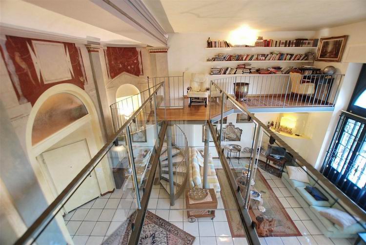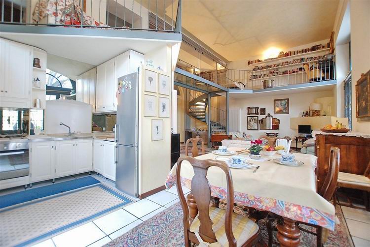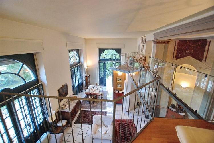 The apartments, with a total area of 162 sq.m., are located on a mezzanine floor, in a villa built in the Liberty style in 1910. The apartment is located on two levels. From the hallway there is an exit to a large living room with ceramic tiles of cotto, hand-made, an open kitchen with a dining room and large stained-glass windows that open an amazing view to a terrace of about 60 sq.m. with a view of the river. On the same floor a bedroom with a bathroom and a bathroom for guests. On the upper attic floor connected to the lower floor by an impressive staircase, two bedrooms, a bathroom, a small reading room.