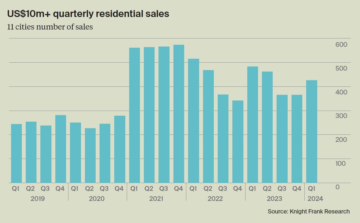Согласно новым данным Knight Frank, за первые три месяца 2024 года на 11 отслеживаемых рынках было совершено 426 продаж недвижимости на сумму более $10 млн. Это увеличение по сравнению с продажами 365 в предыдущем квартале, но представляет собой годовое снижение на 11,6% по сравнению с продажами 482 в первом квартале 2023 года.