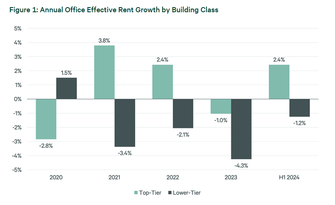 Это влияние сильнее в зданиях низшего уровня, которым часто приходится предоставлять больше уступок, чтобы привлечь арендаторов, чем зданиям высшего уровня. Анализ CBRE показал, что эффективная арендная плата для зданий низшего уровня снизилась на 1,2% с прошлого года, тогда как эффективная арендная плата для зданий высшего уровня выросла на 2,4%.